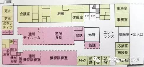设施组成:餐厅、客厅、普通浴室、特别浴室、个人浴室、更衣室、机能训练室、谈话室、茶室、咖啡馆柜台,家属护理教室、商谈室、诊察室、志愿者室、电梯等