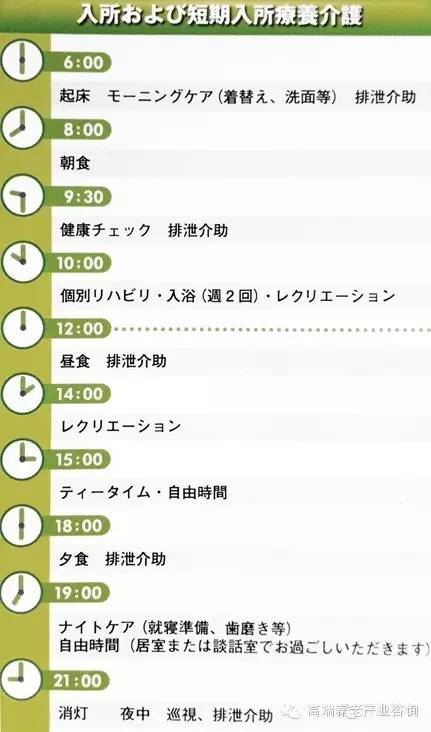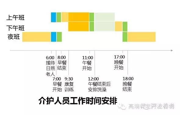 从图中可以看到,在三个餐点,还有康复训练和老人洗澡的时间,都有两班介护人员在岗,这就保证了人员的充足性。