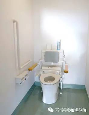 但是对于居家养老的老人来说,卫生间或者淋浴间是老人最容易摔倒的地方。这家养老机构显然也考虑到了这点,为了方便老人冲淋,淋浴间里专门布置了防滑的座椅,并安装了数量充足的扶手。