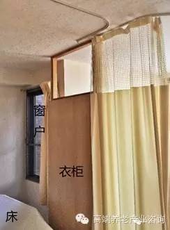 此外,每个房间内都用帘布将老人的床位隔开(见下图),这样每个老人就都有拥有一个相对私密的空间。同时,为了不影响每个位置的采光,柜子顶端留有60cm的空间用以采光,隔断帘的顶部也被设计成了镂空状。
