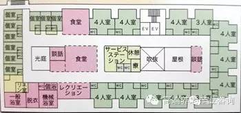 作为一个“成熟的老龄化国家”,在养老机构的设计方面,日本已经形成了一套完整的标准体系。因此,在设计之初,就要考虑到一家养老机构的主要功能有哪些,能满足多少人的需要,服务要覆盖多大的一个社区范围等等。我在养老机构参观的时候,院长对机构内的各项数据如数家珍:机构的人均居室面积为13㎡;居室面积和公共面积之比为1:1;食堂的人均面积为2㎡;公共空间的人均面积为0.5㎡;康复训练中心的人均面积为1㎡;谈话区人均0.5㎡等等。